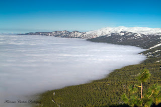 En la lejanía se puede divisar el Observatorio de Izaña con sus numerosos telescopios, así como de buena parte de Las Cañadas cubiertas de un hermoso "manto blanco".